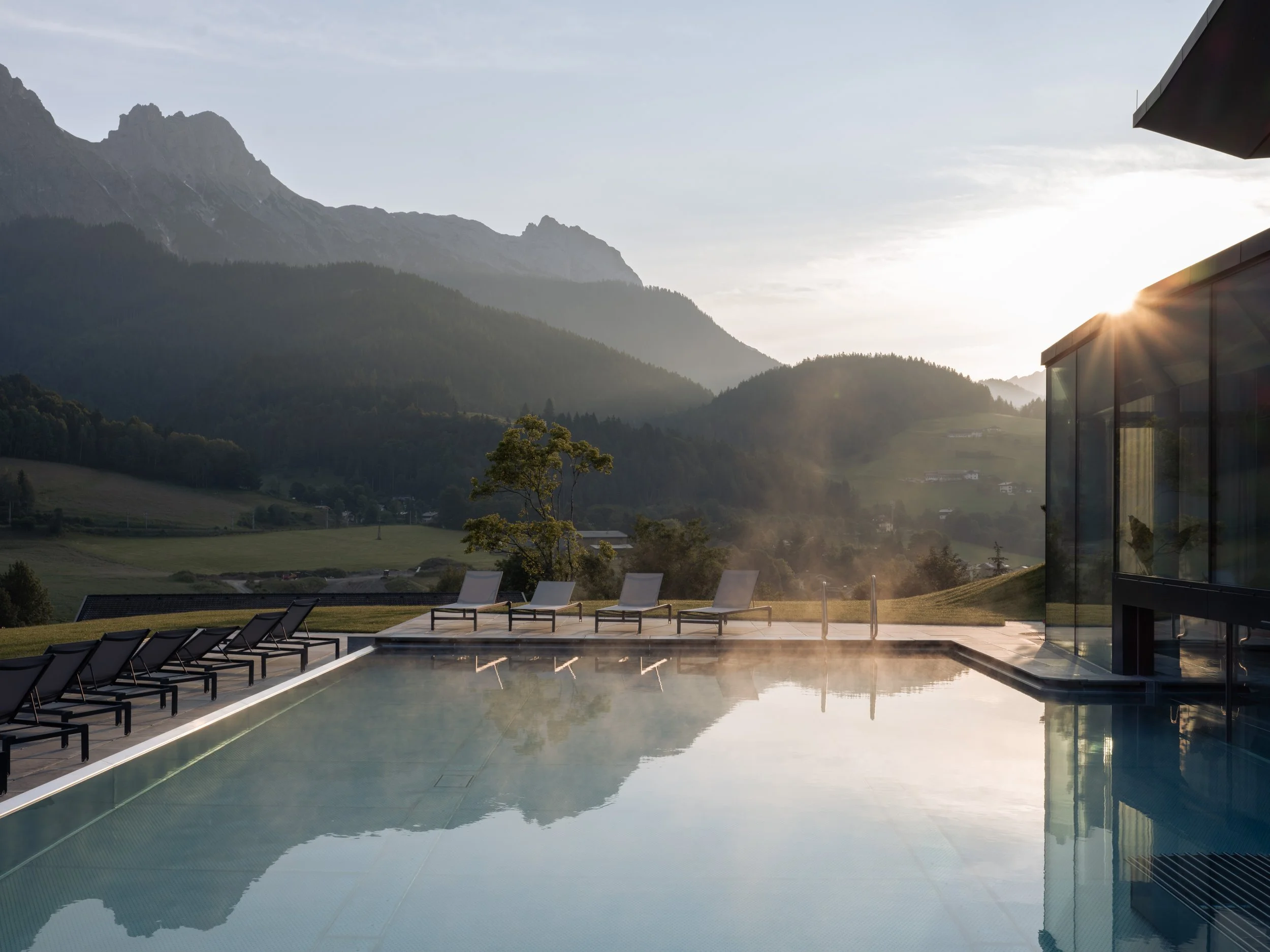 Der Wellnessbereich lädt zum Loslassen ein: Panorama, Innen- und Außenpool, Naturteich, Saunen, Dampfbad und Ruheräume bieten Raum für Erholung und nachhaltige Regeneration.